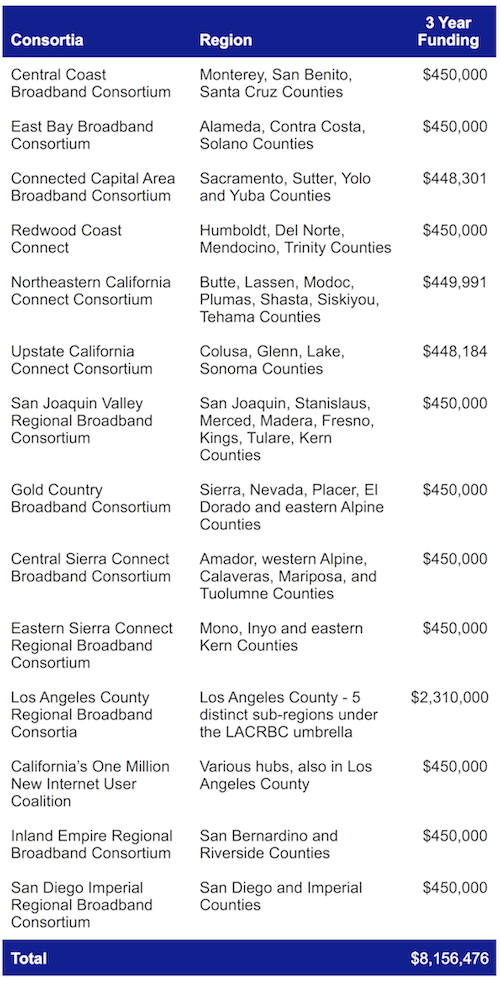 The California Public Utilities Commission approved funding for seven more regional broadband consortia this morning. That brings the total to fourteen consortia representing 49 counties.