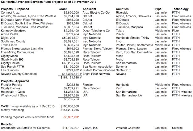 A total of 23 projects were either held over from the last round of CASF project applications or proposed in the current round, which began last December. At that point, there was something like $160 million available to be spent on building broadband infrastructure in California. One – ViaSat’s massive satellite terminal deployment – was rejected. Four projects totalling $5.8 million have been approved; the remaining 18 proposals are asking for a total of $161 million – about $7 million more than is in the kitty.