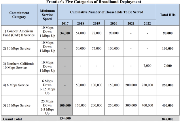It did include a table, shown above, which gives an overview of what it believes its obligations to be. It’s not a revelation. It simply repeats what’s in a similar table included in its 2016 settlement with consumer groups, plus a much smaller promise of 7,000 upgraded homes in northeastern California made to CETF, plus the households that the Federal Communications Commission is paying Frontier $228 million to upgrade via its Connect America Fund program.