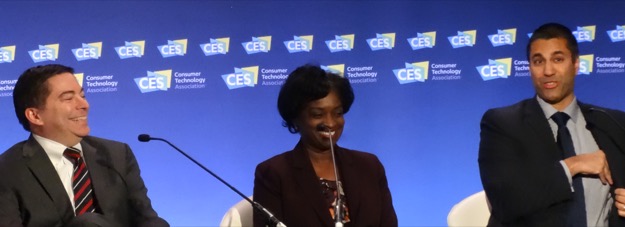 There was an elephant in the packed CES meeting room where three Federal Communications Commissioners spoke yesterday, and no one noticed him. The session, moderated by a deferential lobbyist from the show’s producer, the Consumer Technology Association, ran its full allotted half hour, with no mention of Donald Trump, who will be setting the course for federal telecoms policy when he chooses a new FCC chair – perhaps one of the current republican commissioners, perhaps not.
