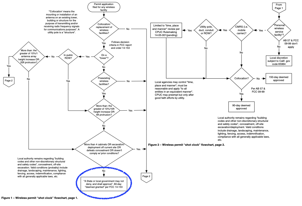The draft declaratory ruling and notice of proposed rulemaking applies to some situations when mobile carriers and other wireless companies seek permission to add equipment to existing towers and the surrounding area. It’s sometimes referred to as the “6409” rule, after the section of federal law that it’s based on. I won’t try to explain it here. The flowchart below illustrates the complexity of federal and state restrictions on wireless permit processing. The box circled in blue is the particular FCC regulation involved. Click to get my white paper that tries to sort it all out.