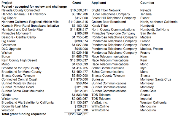 The largest projects have caught the most flak. By far, Golden Bear Broadband is asking for the most money and ViaSat is claiming the biggest chunk of California. Those two have also attracted the most protests.